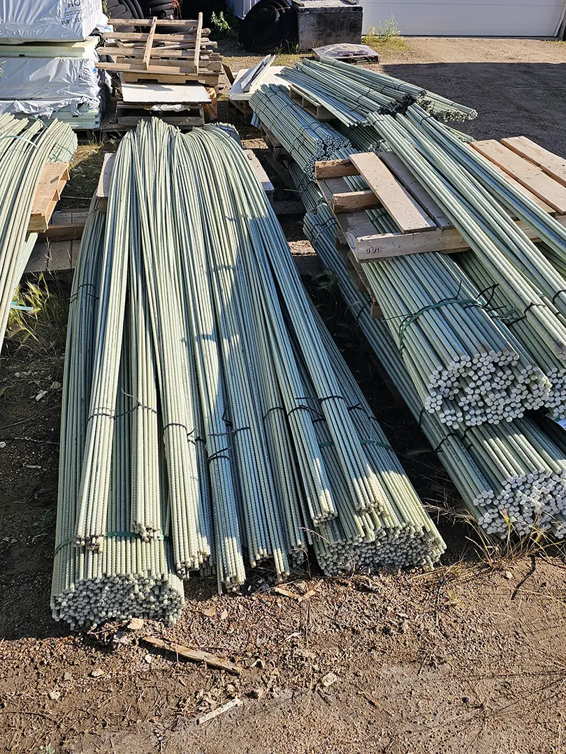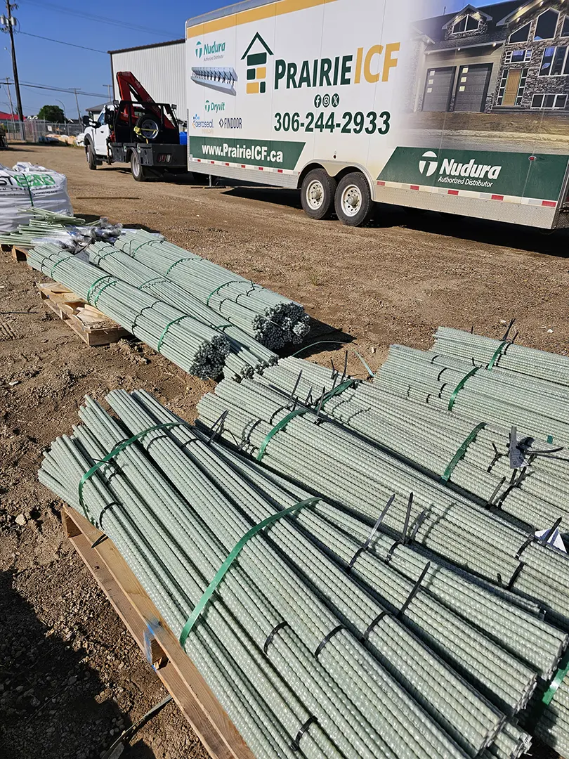 At Prairie ICF we are always looking for ways to improve construction efficiency. With this goal in mind, we are offering MST-bar to complement our Nudura products. MST-Bar is a GFRP (Glass Fiber Reinforced Polymer, aka “fiberglass rebar”) that is engineered for use in ICF walls in Canada. Pre-bent corner bars and pre-cut length of bar to coincide with common Nudura wall heights are in stock to reduce/eliminate time for cutting rebar and the associated material waste. At less than a third of the weight of steel rebar, this product can greatly improve safety on site while reducing worker fatigue.